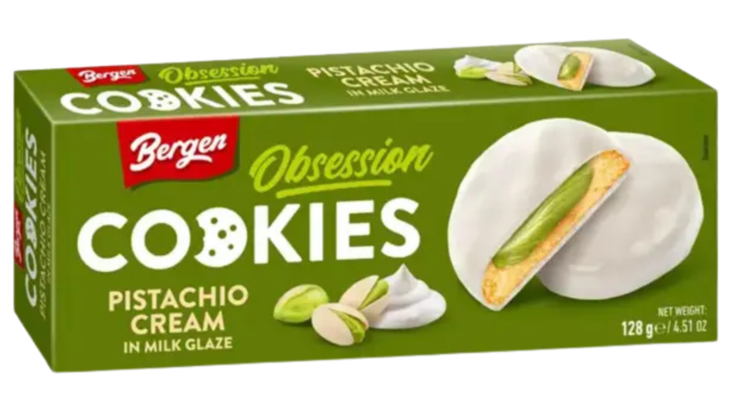 Ingrediente: făină de grâu, glazură de lapte 27,96% (zahăr, ulei de rapiță, lapte praf integral, lapte praf degresat 1,8%, emulgator: lecitină [din soia]), cremă de fistic 25,99% (zahăr, lapte praf integral [din lapte], grăsimi vegetale [ulei de cocos, ulei de rapiță], pastă de fistic 2,5%, ulei de rapiță, colorant alimentar [complecși de cupru cu clorofilă, extract de rizom de turmeric], grăsimi vegetale [ulei de cocos, ulei de rapiță], zahăr, sirop de glucoză, aromă, agent de creștere: carbonați de sodiu), sare.